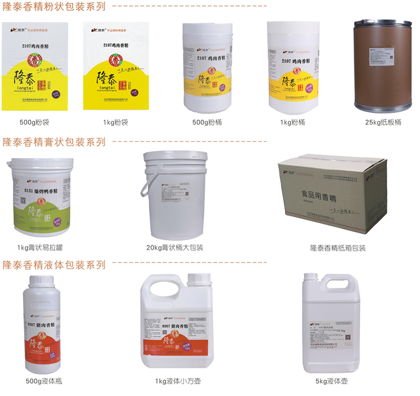 “隆泰”咸味香精系列產(chǎn)品,有粉狀(拌合型、噴霧干燥型、微波干燥型)、膏狀和液體(水溶性、油溶性)三種劑型,包括雞肉香精、豬肉香精、牛肉香精、爆烤鴨香精、羊肉香精、海鮮類香精、蔬菜類香精、麻辣風(fēng)味香精等系列產(chǎn)品,產(chǎn)品主要應(yīng)用于肉制品、方便面、方便粉絲、雞精、膨化休閑食品、復(fù)合調(diào)味品、速凍食品等多個行業(yè)領(lǐng)域。